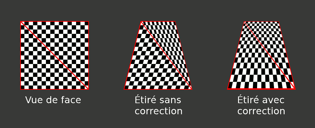 Les premières implémentations d'application de texture se faisaient par une interpolation linéaire d'une image sur un triangle forcément vu de face, ce qui occasionne le bug suivant sur un mur en vue oblique :