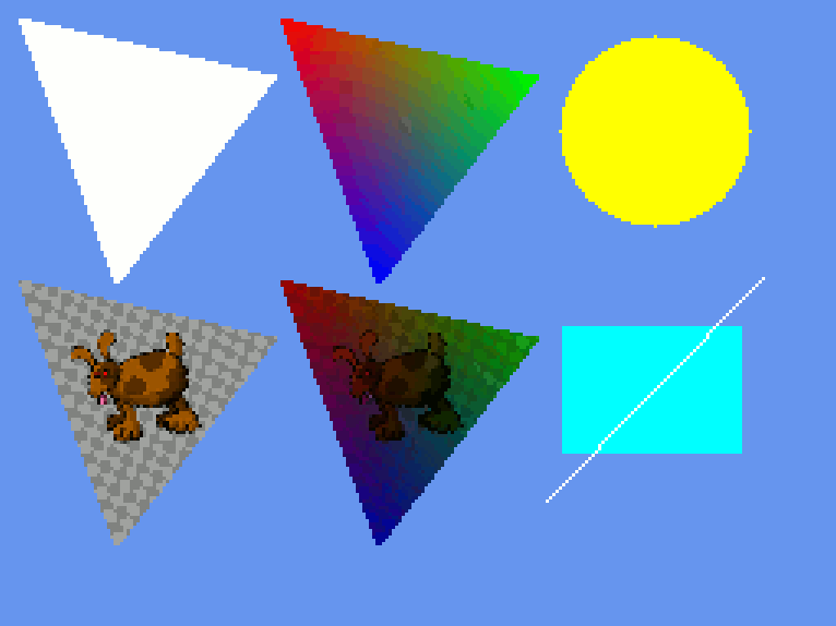 Les trois premières primitives étaient relativement populaires dans les jeux 3D du début des années 90, pour faire des particules et des explosions. La partie 2D ne contient pas encore de mode de fusion spécifique, les formes se recouvrent à l'affichage.