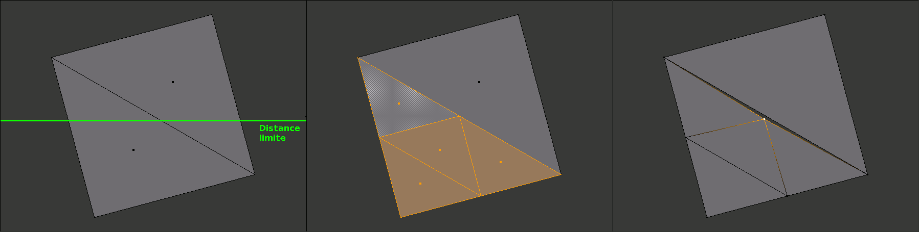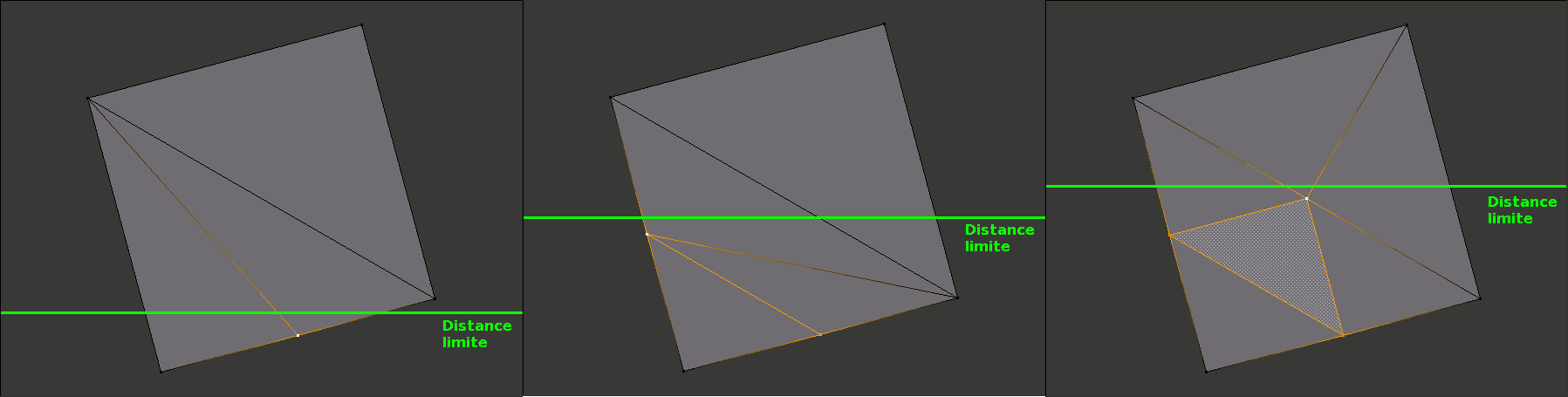 Pour régler le problème de fractures, il faudrait propager la subdivision du triangle concerné à ses voisins, sans subdiviser l'intégralité du modèle. Cette fois, il faut appliquer le test de distance non pas sur le centre du triangle, mais sur le centre de ses arêtes. Cela donne plusieurs scénarios selon les barycentres qui passent sous la limite de distance :